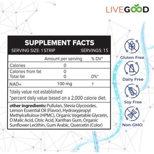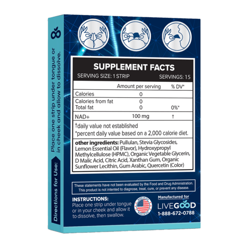 LiveGood NAD+ Dissolvable Strips are formulated to support healthy NAD+ levels using a convenient dissolvable oral strip delivery system, offering an accessible alternative to capsules and powders.
