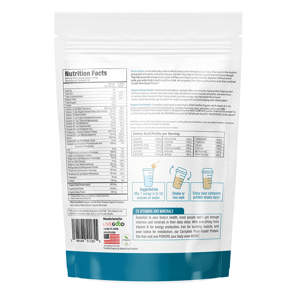 LiveGood’s Complete Plant-Based Protein is designed to fuel your day with complete amino acids, gut-friendly fermented pea protein, and organic hemp – without dairy, gluten, or artificial junk.